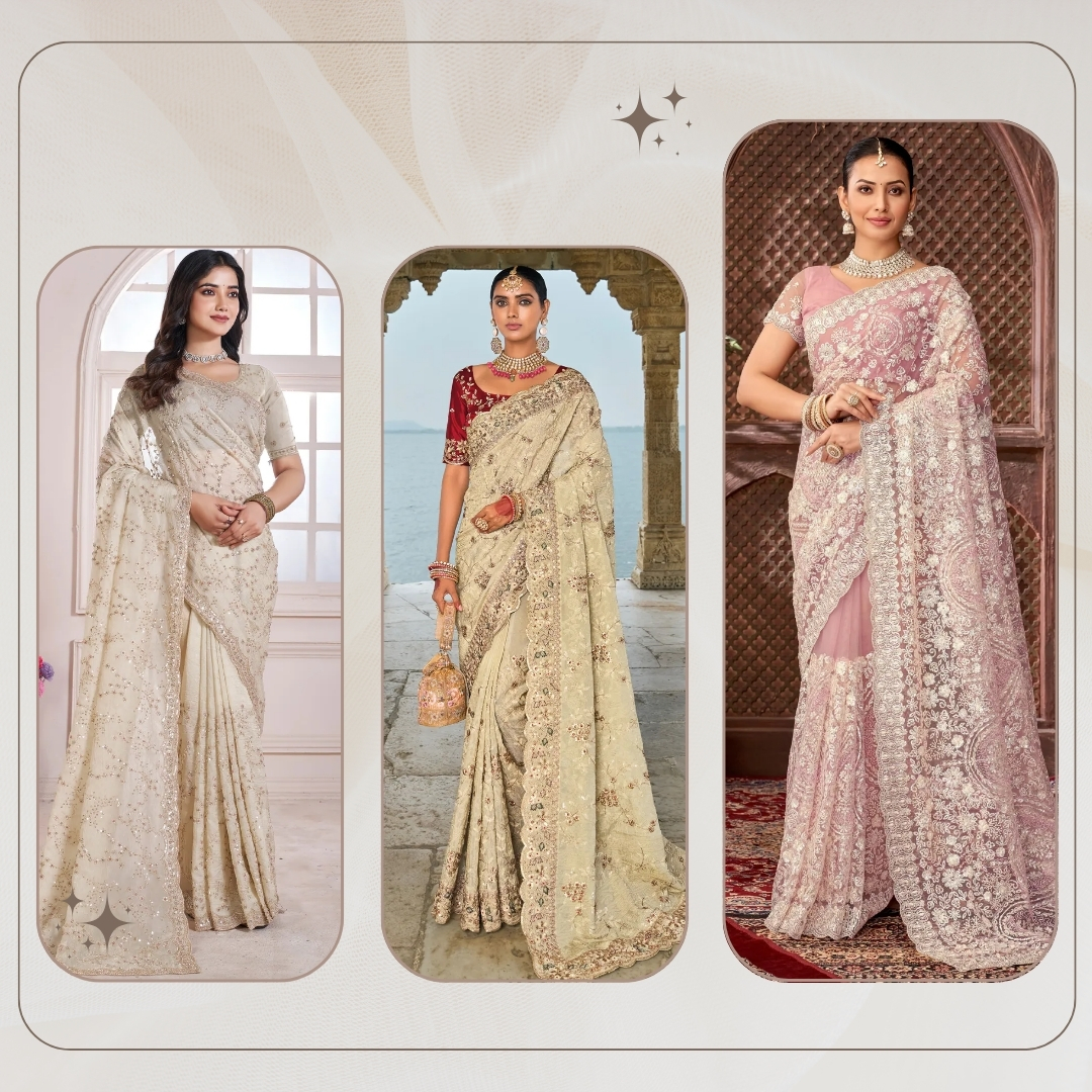 Sarees made of net, georgette, or chiffon with delicate hand embroidery, beads, or sequins are both easy to wear and have an ethereal look. These sarees are perfect for brides who want to be able to move around easily without giving up charm and grace.