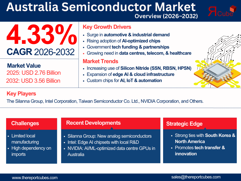 According to a recent study by Report Cube, the Australia Semiconductor Market reached a value of nearly USD 2.76 Billion in 2025 and is expected to grow at a CAGR of 4.33% from 2026 to 2032, reaching around USD 3.56 Billion by 2032. This growth highlights Australia’s evolving role in the global semiconductor ecosystem.